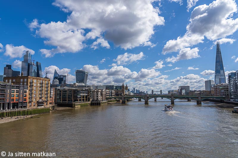 Tuolla jo mainitsemallani kevään 2023 Lontoon vierailulla kävelimme usein Millennium Bridgen yli, koska majapaikkamme sijaitsi vain lyhyen matkan päästä sillasta Banksiden puolella. Olimme jo ehtineet varsin nopeasti koluta majapaikan lähistön vähät nähtävyydet ja kaikki muu mielenkiintoinen kävelymatkan päässä sijaitseva tuntui löytyvän joen toiselta puolelta. Millennium Bridge tarjosi oivan oikoreitin joen yli. Siinä samalla ehdimme ihailla itse siltaakin aiempaa paremmin. Samalla havaitsimme myös sillan sijaitsevan mainiolla paikalla jokimaisemien katselemista silmällä pitäen. Länteen päin maisema ei ehkä ole kovin ikimuistoinen, mutta idän suunnalla kohoavat Cityn korkeat talot sekä vastarannan Shard näkyvät sillalle hienosti. Myös taustalla kohoava Tower Bridge erottuu idän suuntaan katsoessa.