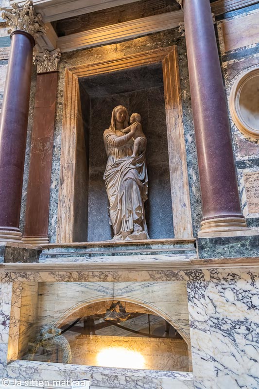 Renessanssiajalta lähtien Pantheoniin on haudattu useita merkkihenkilöitä. Joukossa on niin taiteilijoita kuin Italian kuninkaitakin. Taiteilijoista meille jäi vahvimmin mieleen enkeleistään kuuluisan taidemaalari Rafaelin hauta. Haudan yläpuolella on mestarin oppilaan Lorenzo Lottin Madonnaa ja lasta esittävä veistos. Vuonna 1520 kuollut Rafael toivoi itse Pantheonia hautapaikakseen. Erikoisena sivuhuomautuksena mestarin arkku avattiin paavi Gregorius XVI:n määräyksestä vuonna 1833, jotta sen sisältämien maallisten jäännösten autenttisuudesta saataisiin varmuus. Olisi jännä kuulla, millä tavoin tuon ajan tekniikalla tästä asiasta lopulta tehtiin päätös, mutta aitous joka tapauksessa todettiin ja loota suljettiin.