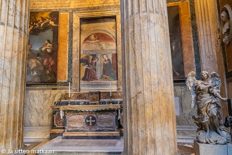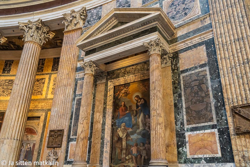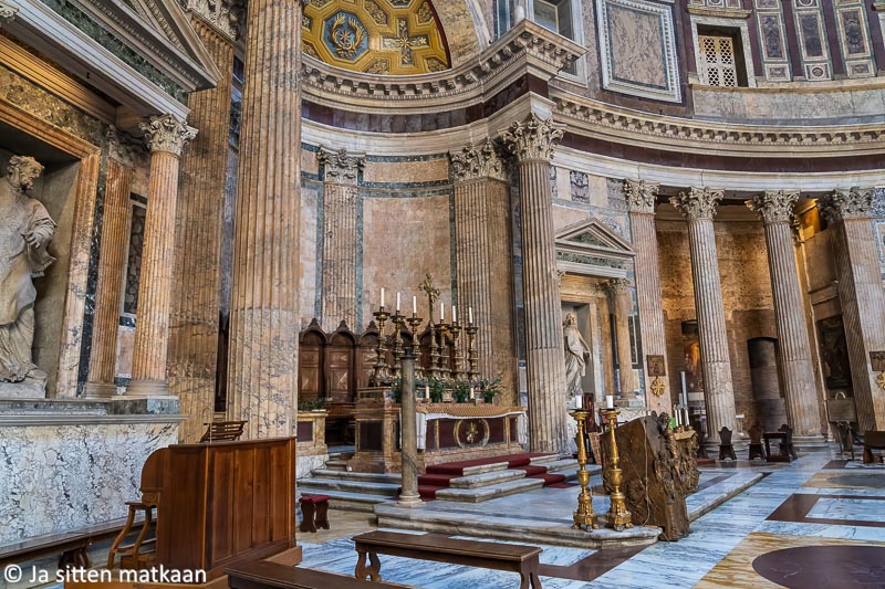 Hautojen lisäksi rotundan seinustoilla on useita pieniä sivukappeleita. Ne edustavat useita eri aikakausia ja jokaisessa on jotain mielenkiintoisia taideteoksia ihmeteltäväksi. Kirkko vaikuttaakin aluksi hyvin yksinkertaiselta pyöreältä tilalta ja ensin katse kiinnittyy vain valtavaan kupoliin. Vasta sen jälkeen silmä alkaa löytää joka puolelta kauniita yksityiskohtia. Ihan joka nurkan koluamiseen kuluu tovi jos toinenkin, etenkin kun osa ajasta menee ihmisten väistelemiseen. Vaikka Pantheon on todella paljon pienempi kuin Pietarinkirkko, suhtaudun siihen samalla tavoin. En yritäkään jaksaa tutkia jokaista kappelia ja kolosta yhdellä kerralla. Roomaan tulee kuitenkin aina palattua uudestaan, jolloin tutkimuksia voi taas jatkaa. Pantheon on yksi näistä jokaisen reissun ohjelmaan mahtuvista kohteista.