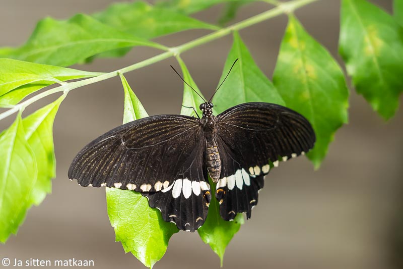 Vaimoni suosikki puutarhan kohteista oli perhostalo, johon luodussa trooppisessa ilmastossa monet suuret ja värikkäät perhoset tuntuivat viihtyvän mainiosti. Ulkona vallitsevan helteisen tunnelman päälle vierailu perhostalossa oli kuin piipahdus saunaan. Jos ei ulkona jo ollut hiki, ei paita taatusti pysynyt kuivana perhostalossa. Ainakin kesällä 2024 perhosia oli nähtävillä kasvitieteellisen puutarhan sisällä pienehkössä kasvihuoneessa, jonne oli erillinen 5€ lisämaksu. Tämä ei kuitenkaan vaikuta pysyvältä rakennelmalta, eikä sitä näy kartalla eikä puiston nettisivuilla. Löysin mainintoja vain tropiikin kasveja esittelevästä kasvihuoneesta. Puiston Via del Corson sisäänkäynnin vieressä on erillinen perhostalo Casa delle Farfalle, johon ymmärtääkseni pystyy tutustumaan käymättä itse kasvitieteellisessä puutarhassa. Sisäänpääsymaksu näkyy olevan 9€. Paikan nettisivut ovat valitettavasti vain italiaksi.