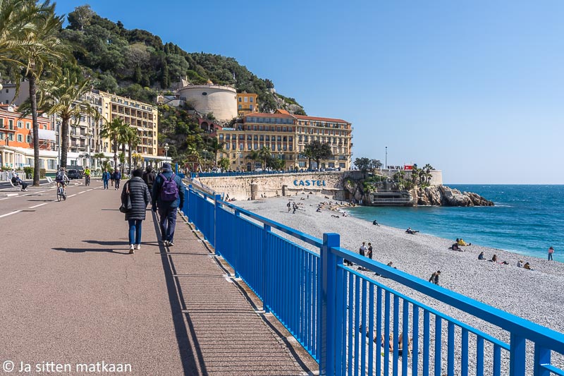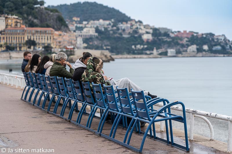 Rantakadulla kävellessämme ihmettelimme aluksi miksi ranta näytti jotenkin erilaiselta kuin aiemmin. Sitten huomasimme, että kesäkauden rantaravintolat aurinkotuoleineen olivat poissa. Olemme aina aiemmin vierailleet Nizzassa kesällä tai korkeintaan alkusyksystä, joten emme ole nähneet rantaa aiemmin tyhjänä. En siksi osannut edes olettaa, että nuo melkoisen kokoiset rakennukset oikeasti viedään talveksi pois rannalta. Aamupäivisin saimme parvekkeelta seurata kaivinkonetta, joka teki tulevan kesäkauden alkuvalmisteluja.