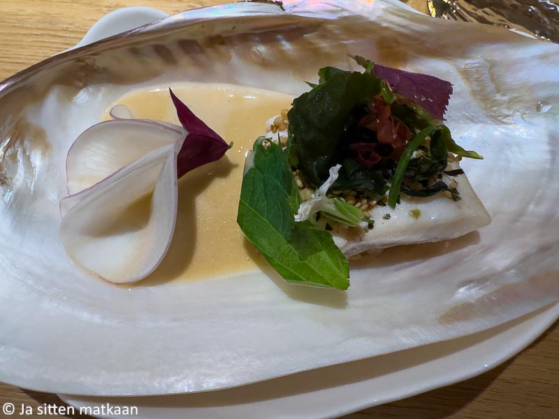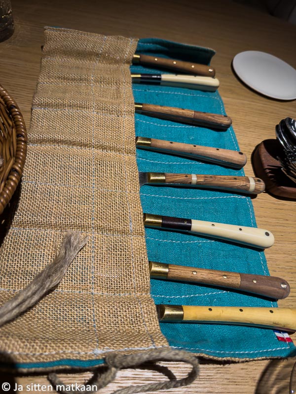 Ruoan suhteen pidän yllätyksistä, mistä johtuen en tutustunut ravintolan tyyliin etukäteen. Tällaisissa paikoissa tarjolla on vain valmiita menuja, tällä kerralla kaksi erilaista. En niitäkään silmäillyt kovin tarkasti, vaan tein valinnan ihan vain ruokalajien määrän perusteella. Siksi ravintolan japanilais-ranskalainen fuusiotyyli selvisi minulle vasta ensimmäisten annosten myötä. Tämä olikin hyvä, sillä fuusiokeittiöt eivät ole koskaan olleet lähellä sydäntäni. Olisin vain turhaan säikähtänyt ja kenties valinnut kokonaan toisen ravintolan. Nähtävästi tälläkin tyylillä voi kuitenkin onnistua. Lopputuloksena oli melkoinen kulinaristinen seikkailu ja makujen ilotulitus. Kun japanilaisiin superumamisiin kastikkeisiin lisää voita, on voittajaresepti valmis. Kun vielä seikkailu sisälsi aimo annoksen leikkimielisyyttä, alkaen veitsen valinnasta muutaman vaihtoehdon joukosta, olin enemmän kuin tyytyväinen juhlaillalliseeni.