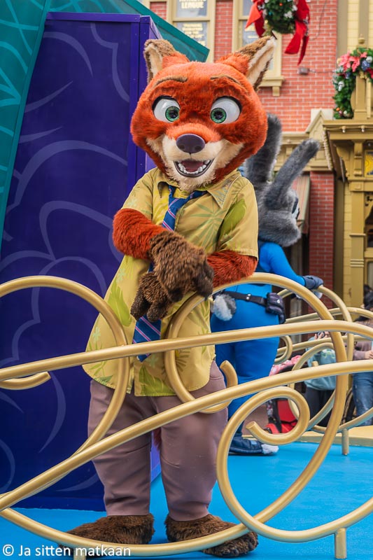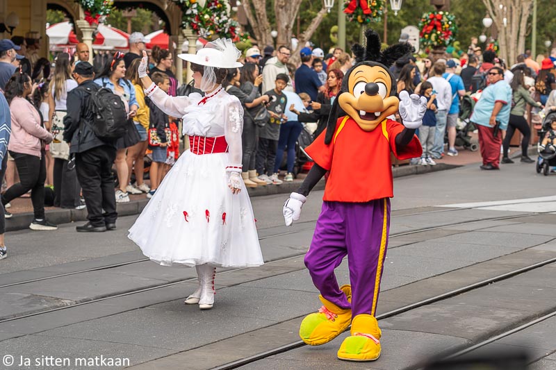 Emme varsinaisesti haikailleet laitteiden perään, sillä jopa yleensä varsin leppoisiin Haunted Mansioniin ja Jungle Cruiseen oli niihinkin yli tunnin jono koko ajan. Lopulta päätimme kuitenkin kokeilla hauskaksi kehutun Seven Dwards Mine Trainin, johon oli tasaisesti noin tunnin pituinen jono. Menimme jonoon juuri vähän ennen päivän suuren paraatin alkua. Toivoimme ajankohdan vaikuttavan jonon pituuteen. Yleensä kaikki kun tuntuvat pitävän näitä paraateja puiston kohokohtina. Henkilökohtaisesti en pidä niistä yhtään, sillä ne aiheuttavat muutoinkin tolkuttoman tungoksen pahenemista entisestään ja hirveällä völyymillä soitettu musiikki tuntuu tuhoavan tärykalvot.