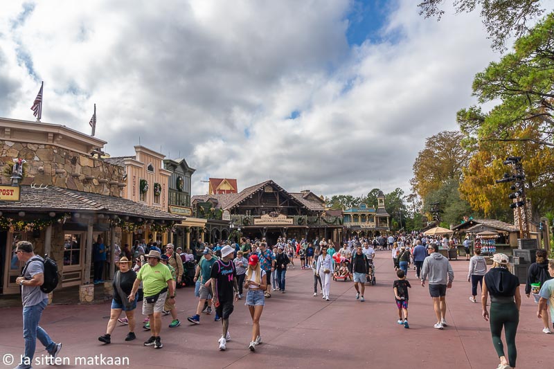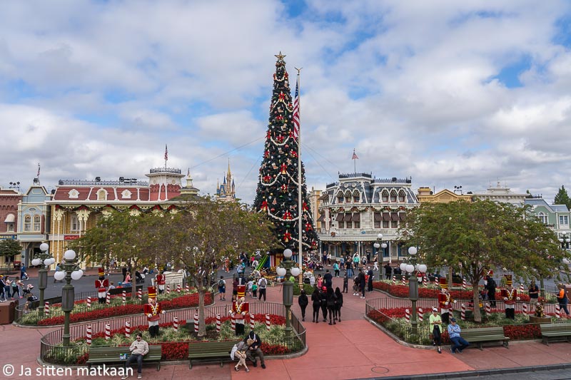 Perillä meitä odotti tuttu Disney-sää. Edellisellä Disney World –vierailullamme aurinko jaksoi pilkahtaa vain hetken ajan ja loppu päivä sujui pilvisen taivaan alla. Näin kävi nytkin. Puisto oli tästä huolimatta kivan näköinen ja virallisen joulukauden päättymisestä huolimatta koristeet olivat edelleen esillä. Missähän vaiheessa ne ylipäänsä ehditään poistaa, puisto kun on kuitenkin joka päivä auki.