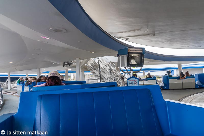 Moista katastrofiautoilua ei voinut jättää mitenkään puiston viimeiseksi laitteeksi, joten päätimme jonottaa vielä siitä ihan vierestä löytyvään Tomorrowland Transit Authority PeopleMoveriin, joka oli hassu ilmaratajuna. Jono oli varsin maltillinen, kyyti leppoisaa ja näkymät katutason yläpuolelta mainiot. Tähän oli hyvä lopettaa ja todeta Disney-päivän olevan paketissa.