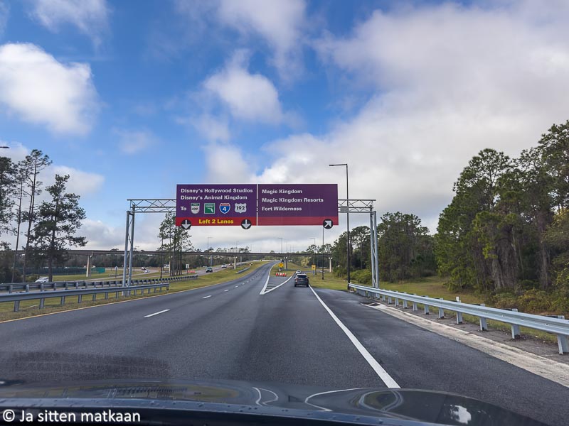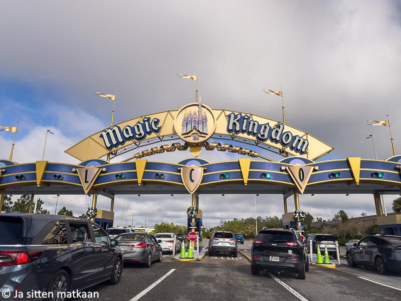 Saapuminen puistoon oli tuttua Disneytä mainioine opasteineen. Tosin ilman navigaattoria olisimme eksyneet heti alkumetreillä, sillä jostain syystä moottoritiellä ei opasteissa mainittu ollenkaan Magic Kingdomia, vaikka muut puistot kyllä koreilivat kylteissä. Epcotin liittymästä käännyttyämme Disneyn opasteet kuitenkin hoitivat loput. Parkkialueella meidät ohjattiin suoraan seuraavaan vapaaseen ruutuun ja pian istuimmekin auton vetämässä vaunussa kohti puistoa. Disneyn mobiilisovellukseen oli mahdollista tallentaa auton sijainti sen myöhemmän löytämisen helpottamiseksi. Tämä vaikutti todella kätevältä, ainakin siinä vaiheessa.