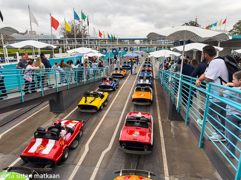 Päästyäni kääpiöiden junassa sopivasti vauhdin makuun, päätin jatkaa samoissa tunnelmissa viereisestä Tomorrowlandista löytyvän Tomorrowland Speedwayn kyydissä. Tähän autorataan kun oli sopivasti vain vartin pituinen jono. Paperilla hauskan kuuloinen laite osoittautui todelliseksi pettymykseksi. Tähän autoilukokemukseen oli saatu hienosti pakattua kaikki autourheilun huonot puolet ja jätettyä pois ne parhaat. Polttomoottorikäyttöiset autot pitivät valtavaa meteliä ja ajelun jälkeen hiukset ja vaatteet haisivat pakokaasuille. Vauhdin huumasta ei sitä vastoin ollut tietoakaan auton madellessa hitaasti pitkin rataa. En ymmärtänyt tämän laitteen hienoutta laisinkaan, kokemus muistutti kovasti polttomoottorikäyttöisellä ruohonleikkurilla ajamista, jota en ole ikinä oikein osannut mieltää hauskanpidoksi. Hajukin oli tuttu ja vaatteet menivät suoraan pyykkiin. Eikö olisi jo aika näissä leikkiautoissakin unohtaa moinen sata vuotta vanha tekniikka ja ottaa vastaan sähköinen tulevaisuus.