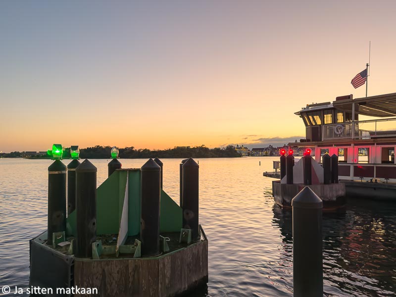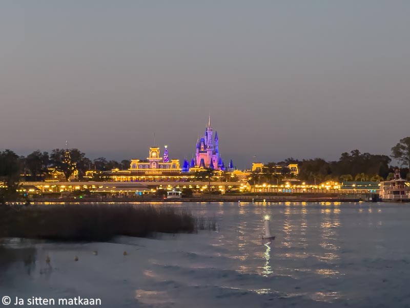 Kohti autoa matkatessamme päätimme tällä kerralla valita lauttavaihtoehdon. Paatti saapuikin onneksi pian. Aurinko oli jo laskenut ja matkan ajan saimme nauttia kaupan päälle hienosti valaistun Magic Kingdomin siluetista. Loppu matka parkkipaikalle tapahtui samanlaisella auton vetämällä vaunulla kuin puistoon saavuttaessakin. Piti vain muistaa, olimmeko pahisten vai hyvisten puoleisella parkkiksella ja minkä hahmon kohdalla olimme hypänneet vaunun kyytiin. Meidän ajokkimme majaili sankarien puolella Simban kohdalla.