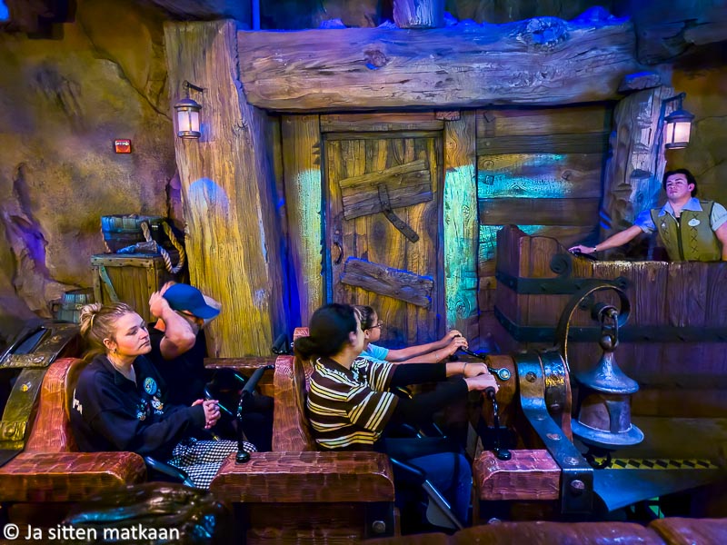 Lopulta selvisimme kääpiöiden kaivosjunasta noin kolmessa vartissa. Olihan siinäkin jonottamista, mutta itse laite oli tuon pienen vaivan arvoinen. Jonotusalue oli alun peruskarsinan jälkeen täynnä hauskoja yksityiskohtia, mikä hieman helpotti odotuksen tuskaa. Juna-ajelu ei ollut kovin pitkä, eikä valtavan nopea, mutta ihan reipasta kyytiä silti mentiin. Tiukat käännökset saivat vauhdin tuntumaan todellista kovemmalta. Sanoisin, että kaivosjuna oli pikkuisen vauhdikkaampi kuin Linnanmäen Pikajuna, aiemmalta nimeltään City Express. Erityisesti vaimoni tykkäsi tästä laitteesta, hänelle se oli koko Orlandon vierailumme numero ykkönen. Tosin hän jätti ne kaikista nopeimmat laitteet minulle.