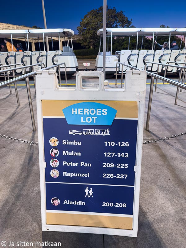 Perillä kuitenkin kävi ilmi, että muutoin mainiosti toiminut Disneyn sovellus oli tässä kohdassa tehnyt meille oharit. Paikka oli tallentunut kahden rivin verran väärin. Autoja oli kuitenkin parkkiksella vielä niin paljon, että silmämääräisesti oikean löytäminen oli mahdotonta. Kärry oli myös niin kaukana, ettei se reagoinut kaukosäätimen tööttönappiin. Sieltä täältä kaikuvista tööttäilyistä päätellen aika moni muukin etsi kulkupeliään. Lopulta ei auttanut muu kuin lähteä systemaattisesti etenemään rivi riviltä nappia painellen.