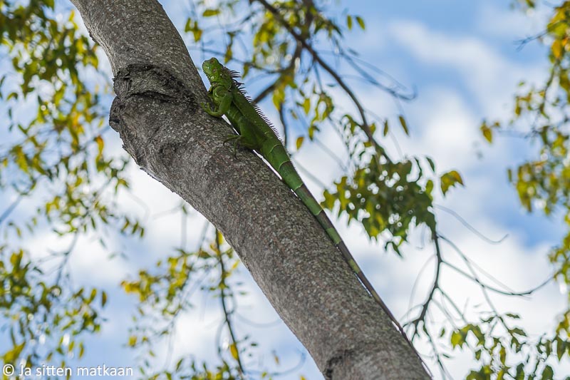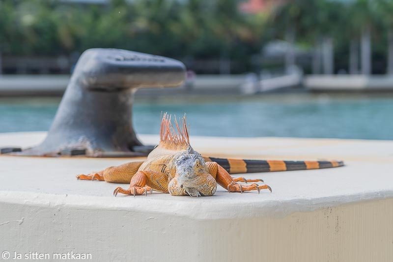 Aivan Miamin sataman nurkalta bongasimme vielä pikkuisen isomman kokoluokan liskon. Laiturin reunalla päivää paistatteli iguaani. Kukaan muista samalla jalkakäytävällä kävelevistä ihmisistä ei huomioinut liskoa mitenkään, kunnes minä aloin sitä kamerallani sihtailla. Pian kännykkäkameratkin alkoivat laulaa.