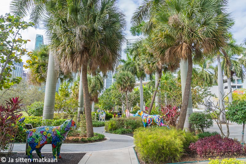 Vaimo valitsi ensimmäiseksi vierailukohteeksi Maurice A. Ferré Parkin, josta löytyi hauska patsaspuisto Dogs and Cats Walkway and Sculpture Garden. Paperilla pikkuisen tylsältä kuulostanut puisto olikin oikein kiva. Eläinpatsaat olivat hauskan värikkäitä ja oikein eläväisen näköisiä. Ihmiset sen sijaan sikailivat. Paikalliset lapset eivät ymmärtäneet kieltoa olla kiipeämättä patsaiden päälle, eivätkä sen fiksumpia olleet heidän vanhempansakaan.