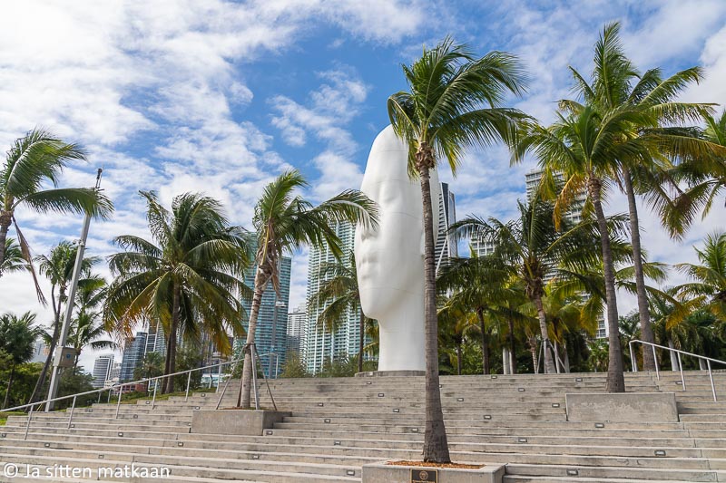 Puisto jatkui rantaan asti ja jotenkin elukat katsastettuamme jalkamme johtivat meidät meren äärelle kuin itsekseen. Haahuilumme ei ollut kuitenkaan päätöntä, sillä rannan tuntumasta löytyi Pérez Art Museum Miamin edustalta tutun näköinen irtopää. Tosin tätä teosta nimeltään Looking into my Dreans, Awilda emme olleet kuitenkaan nähneet aiemmin. Sekoitin sen viitisentoista vuotta aiemmin New Yorkissa näkemäämme teokseen nimeltään Echo. Erehdys oli kuitenkin ihan ymmärrettävä, sillä molemmat pollat olivat Jaume Plensan tekemiä ja kuin yhdestä puusta veistettyjä. Tai siis kovin samantyyppisistä materiaaleista tehtyjä.