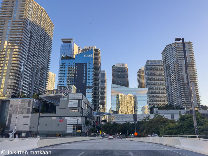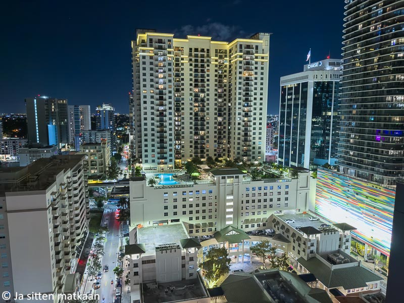 Paitsi että pois motarilta Brickellin alueella Miamin keskustassa laskeutuessamme päädyimme taas puuroiseen liikenteeseen. Eläväinen Brickell oli täynnä niin ihmisiä kuin autojakin. Perjantain afterworkit olivat juuri alkamassa ja kaikki halusivat niihin osallistua. Kiertelimme hitaasti madellen korttelia ympäri kolme kierrosta etsien jotain koloa, johon pysähtyä hotelliin kirjautuaksemme.
