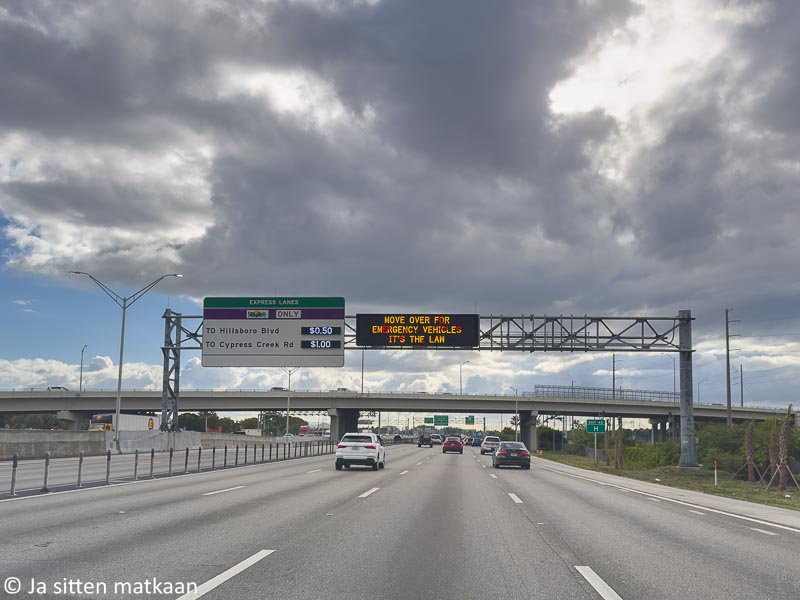 Matka-aika piteni vielä jonkin verran alkuperäisestä arviosta, koska vähän ennen Miamia jouduimme iltapäiväruuhkaan. Vaikka Interstatella oli kaistoja tolkuttomasti, pysähteli liikenne tämän tästä. Navigaattori suositteli äärimmäisenä vasemmalla sijaitsevaa pikakaistaa, mutta sinne päästyämme sekin tökkäsi. Tungos helpotti lopulta vasta jonkin matkaa ennen kaupunkia ja viimeisen pätkän saimme ajella melko leppoisaa vauhtia.