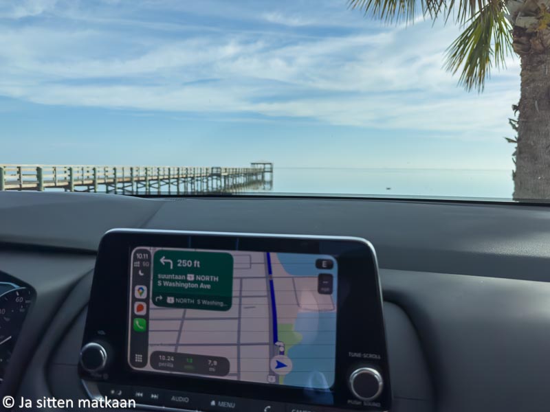 Tarkoituksenani oli jälleen käyttää navigaattorina jenkeissä hyvin toimivaa Google Mapsia. Mukanani olleen kännykkätelineen kiinnittäminen autoon vain osoittautui todella haastavaksi. Puhelin jäi niin hankalaan kulmaan, että näyttöä oli liki mahdotonta nähdä ajaessa. Onneksi kuitenkin pienen ihmettelyn jälkeen kärrystä löytyi Apple CarPlay, joka peilasi kännykän näytöltä navigaattorin auton omalle näytölle piuhan välityksellä. Kokeilimme myös ensimmäistä kertaa vuokraamon tarjoamaa SiriusXM-satelliittiradiota, jossa oli erilaisten musiikkityylien ystäville kymmeniä kanavia. Ehdimme skrollata kanavia Yacht Rockiin asti ja siihen parkkeerasimme. Kanava tarjosi sen verran harmitonta ja leppoisaa autoilumusiikkia, että omat soittolistat jäivät tyystin käyttämättä.
