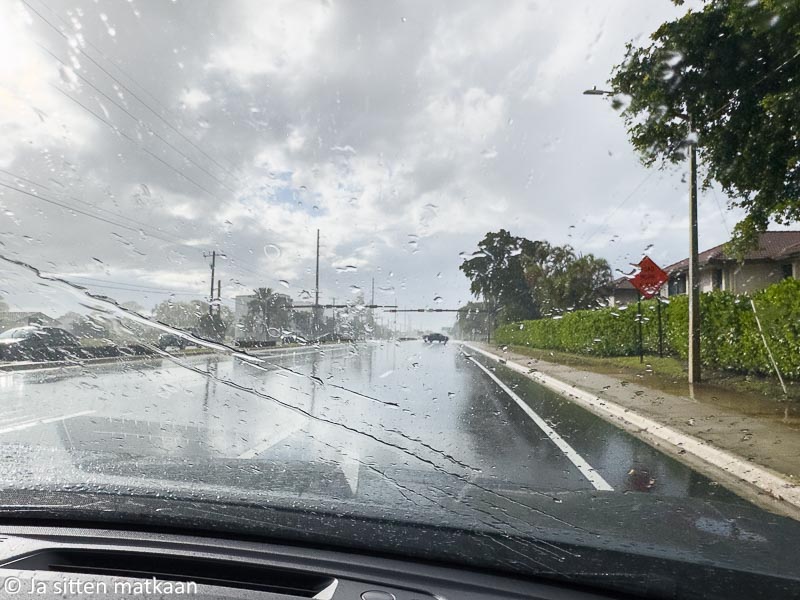 Matka ostarimaisemista Orlandoon eteni aluksi aurinkoisessa säässä, mutta loppua kohti taivas peittyi pilviin. Eipä aikaakaan, kun pilvistä ropsahti oikein kunnon kaatosade. Ajoitus oli varsin oiva, sillä matkapäivinä sateesta on kaikista vähiten kiusaa. Veden tulo loppui sopivasti juuri perille päästessämme, joten emme edes kastuneet autolta hotellille kävellessämme.